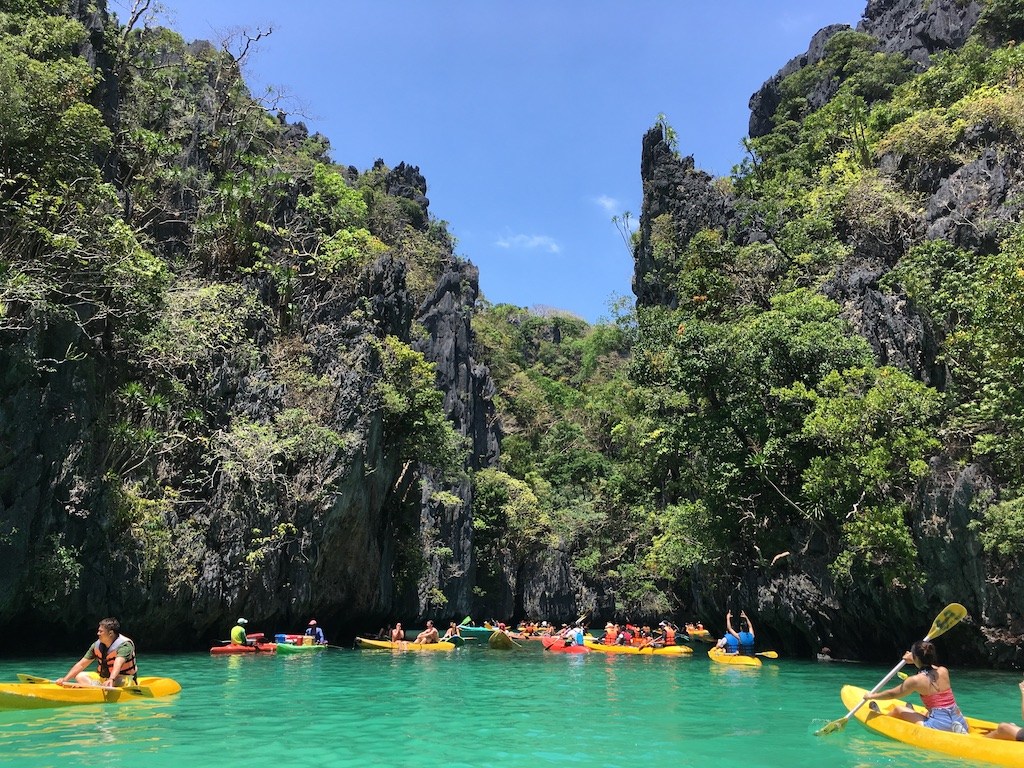 I’m so thankful to be able to do both El Nido Big Lagoon and Small Lagoon in the same day before changes implemented in November 2018. Not one to waste an opportunity, I chose the ‘kayak tour A’ option. When my time in Small Lagoon was complete we headed back out of the narrow entrance and paddled straight past our bangka as our boat mates re-boarded. One of the crew acted as a guide and we simply followed his lead. We proceeded single file along the coast of Miniloc Island towards El Nido Big Lagoon. The water was a little choppy, but it was a short 15 minute paddle and would even suit first timers.